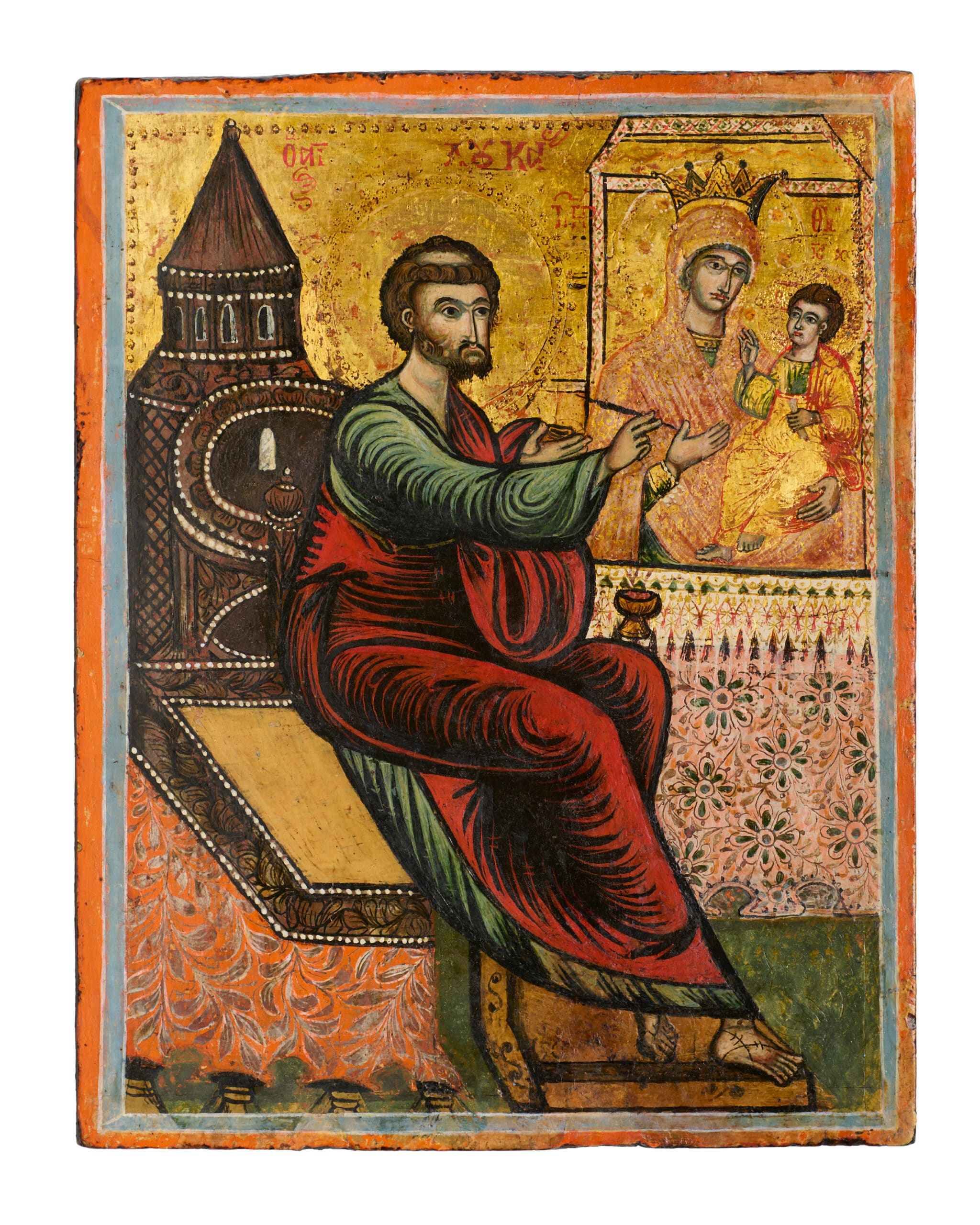 Saint Luke the Evangelist, patron saint of painters, adds the finishing touches to an icon of the Mother of God and Christ Child. Tradition holds that Luke used his trained eye as a doctor to accurately paint Mary and Jesus from life during Christ’s infancy.