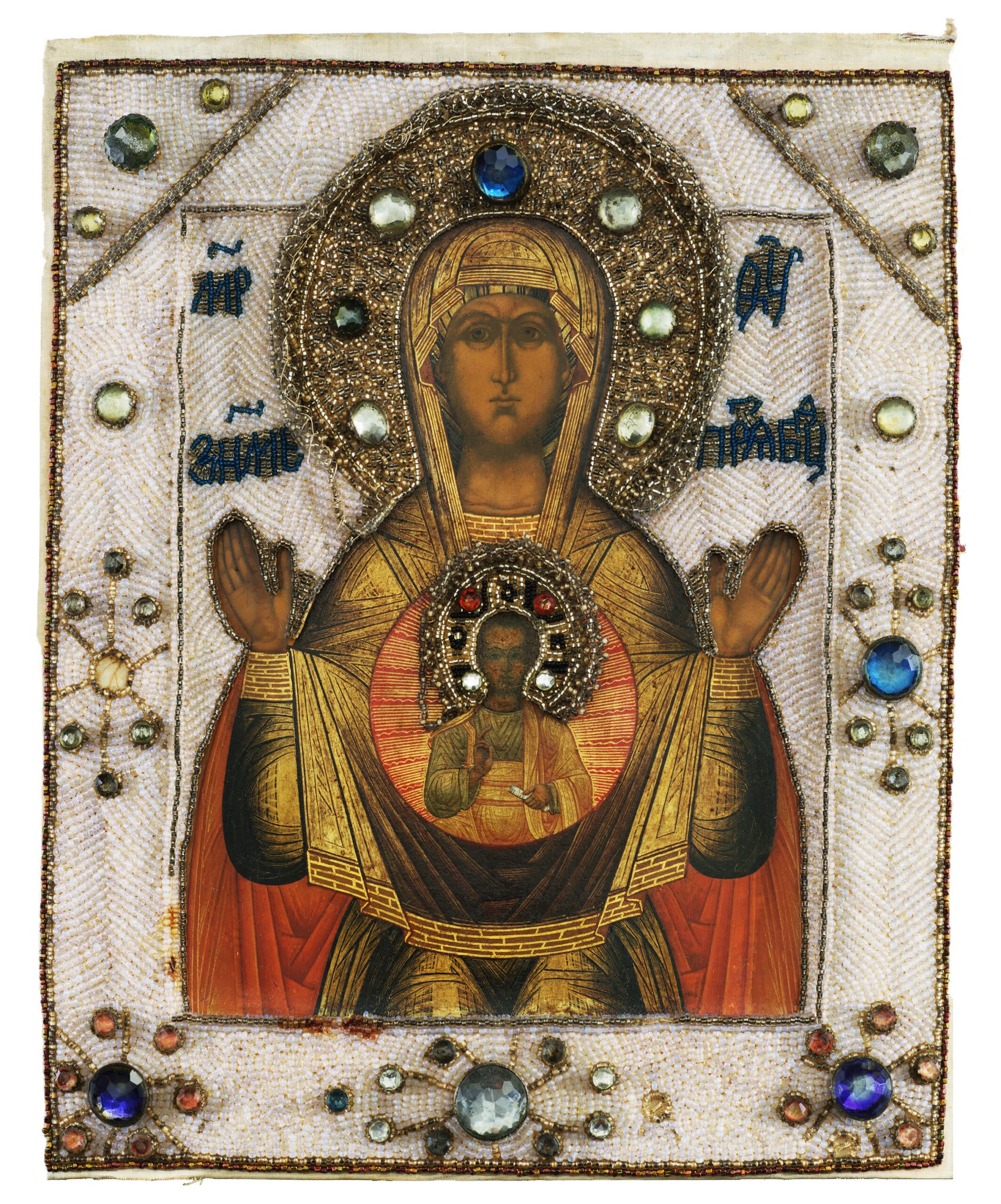 Egg tempera on wood with cloth oklad, paste gems, beads
