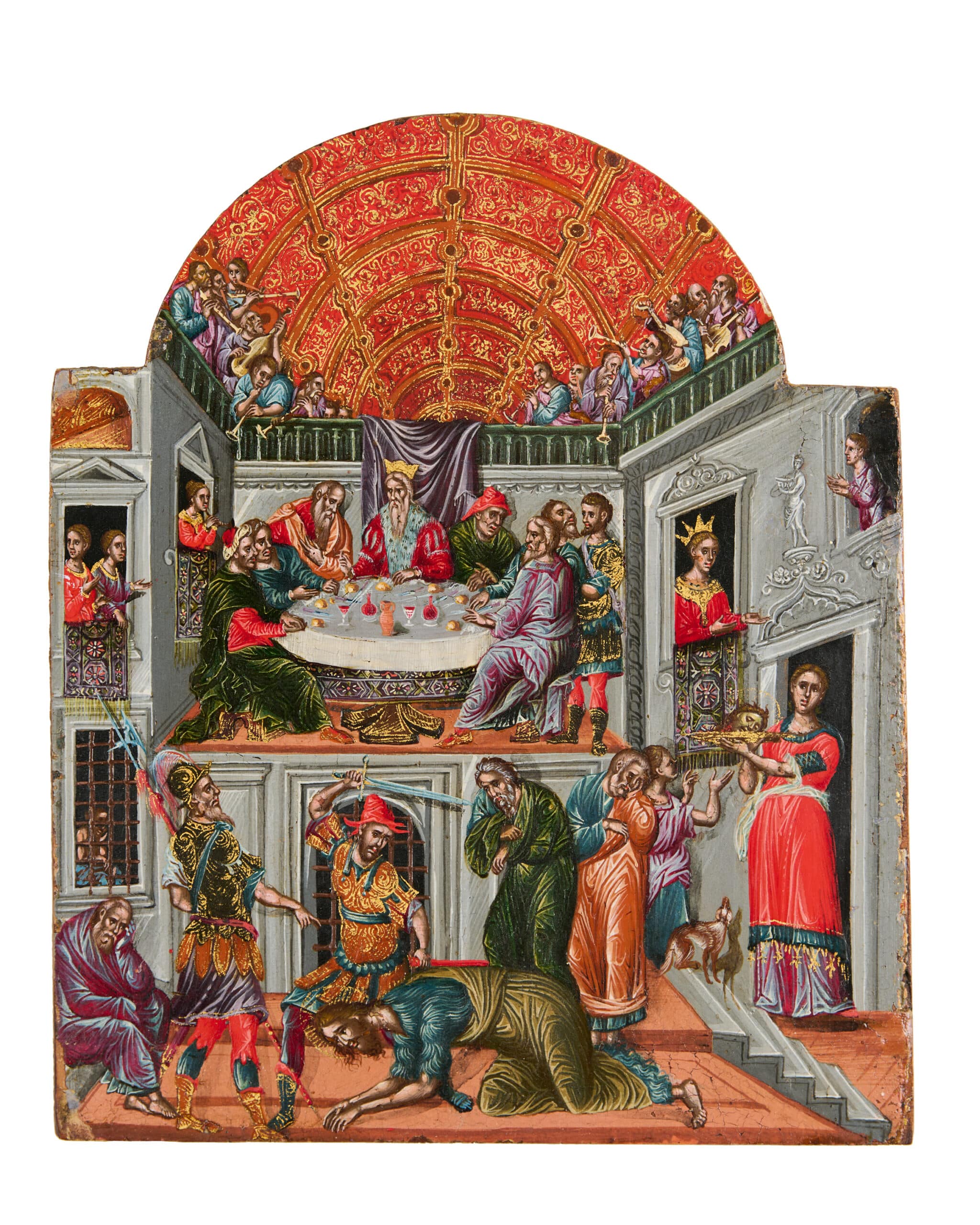 Storm clouds gather over Jerusalem as the Son of God dies on the Cross. Beneath Christ’s wounded rib, the Temple splits in two. At the bottom of the panel Mary faints into the arms of her companions as Roman soldiers dressed as Turks, Germans, and Latins roll dice for Christ’s robe on a backgammon board. The scene is packed: bright robes, glinting blades, and craggy rocks are electrified with white highlights giving the scene an anxious energy beneath the quiet of Christ on the Cross. On the opposite panel, lutes, viols, horns, and recorders fill the din of Herod’s banquet hall under a richly gilded ceiling. Far below the celebratory commotion, John the Baptist is forced to his knees as the executioner’s blade swings towards his exposed neck.