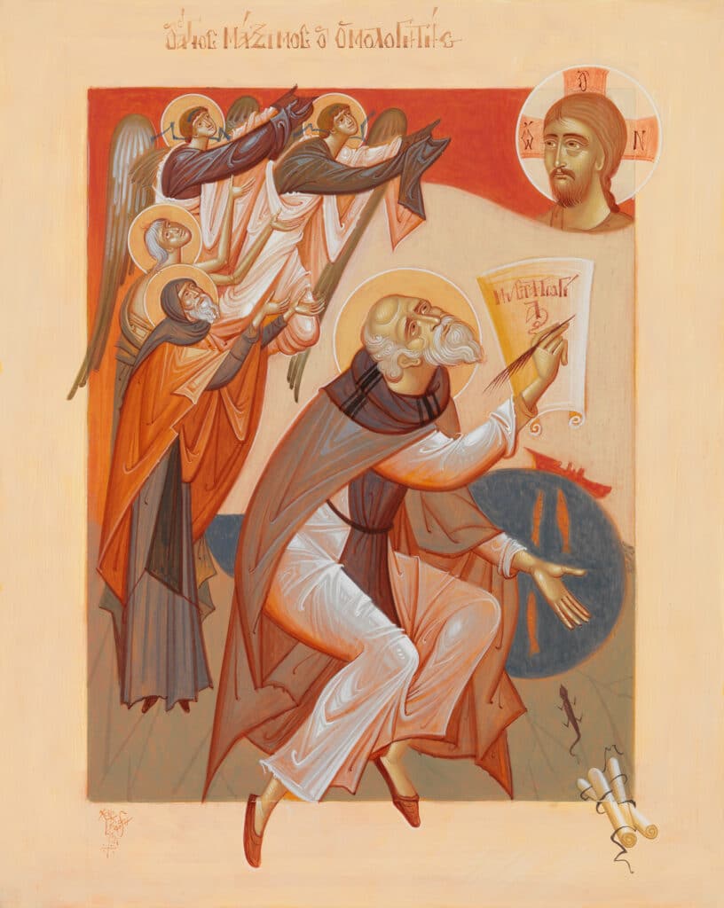 This intimate selection of icons represents Kordis’s artistry and his deep understanding of how color and form interrelate to create a visual narrative. Kordis’s palette is comprised of broken hues on the cooler end of the color spectrum. He uses tints that diverge gently from one another and combine to create soft, flowing forms that complement the crisp, gently edged shapes. Often, a hand, leg, wing, billow of cloth, stone, or chain extends beyond the inner rectangle and onto the border. The color and form of these elements are especially important, as they bring the image out into the world, involving the sacred events in the lives of the viewer, who in turn is invited into the story.
